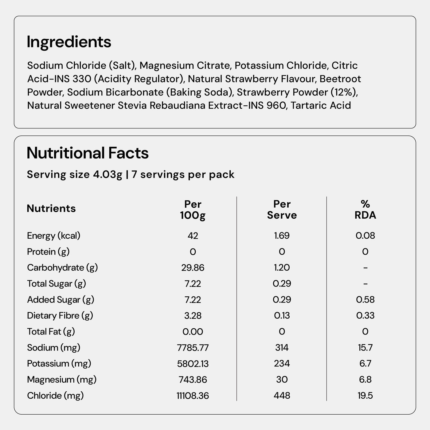 We use common salt (Sodium Chloride) and Potassium Chloride to provide you with sodium and potassium in ample quantities. We also add magnesium citrate - which is a highly bioavailable form of magnesium that aids in muscle recovery. To have a taste & flavour you will love - we use pure stevia extract as the sweetener, and natural fruit flavours & fruit powder. To add some fizz to the drink you make, and maintain the pH balance of the solution - we've added baking soda (sodium bicarbonate), citric acid, and tartaric acid.